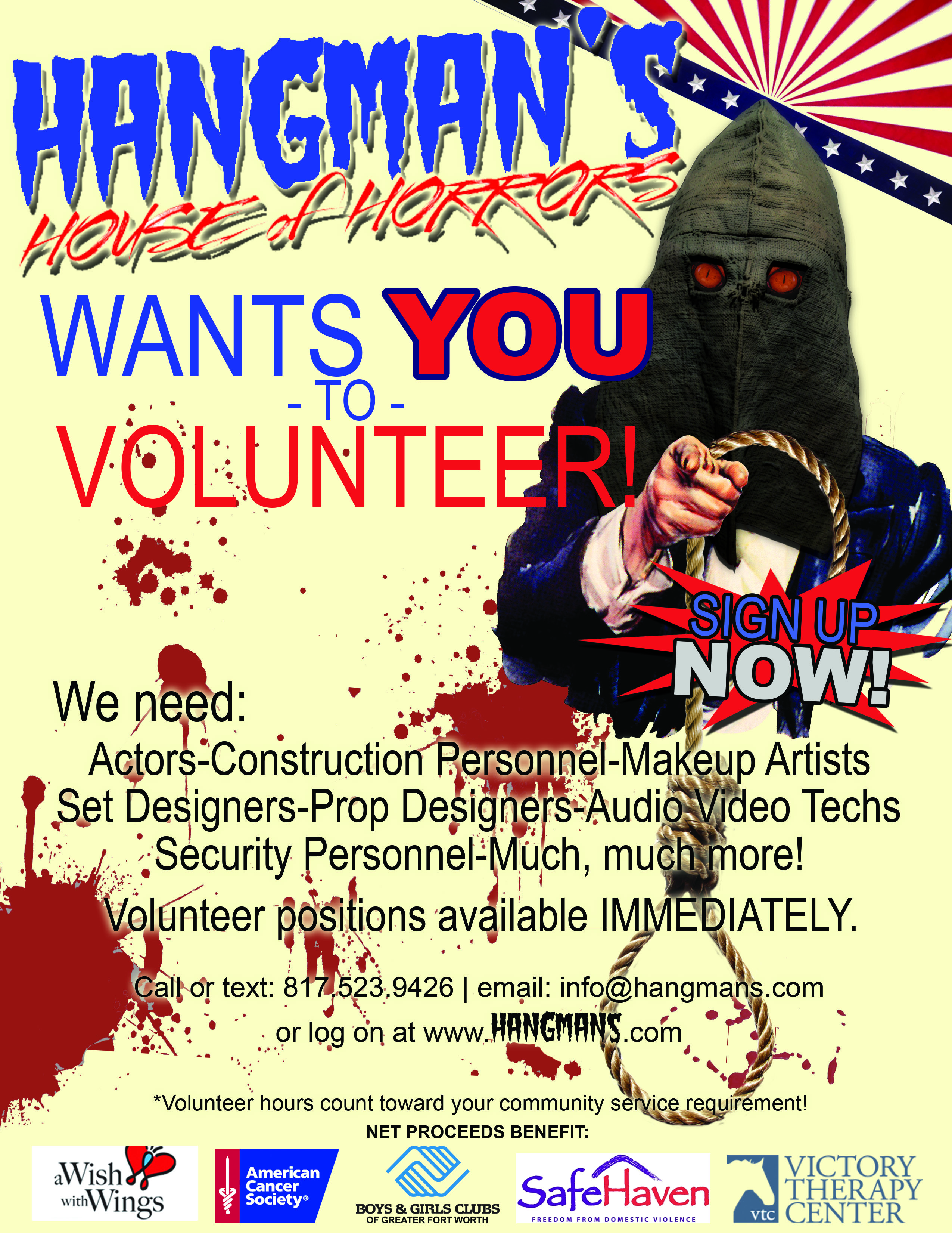 Whether you are interested in working one night or every night of the season shoot us an email and we would love to provide you with all the information to join our haunted family! info@hangmans.com